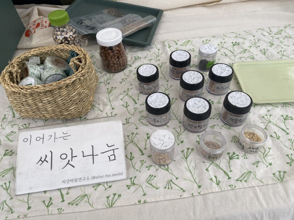 첫 인상은 동화 속 숲속시장 같았어요. 햇수로 9년을 매주(!) 꾸려오셨고, 무제초제 무화학비료 무화학농약 3無 원칙을 지키는 생산자들을 네트워킹하며 농생태적 플랫폼 전환을 실천해왔습니다. 소농, 그중에도 친환경 먹거리 급식이나 생협 유통망, 인증 제도에서도 공백에 있는 소수자성, 다양성을 지닌 소농들을 위한 공간이예요. 토종씨앗을 매개하고, 식품 유통에 대한 법적 규제가 농민이 가공한 먹거리를 상품 기준으로 규율하고 단속하는 움직임에 맞서 물물교환 등의 방식을 모색하는 등 “대안의 대안”을 지향합니다. 지원금에 의존하지 않고, 자원활동에 기반한 자치로 운영되고 있습니다.