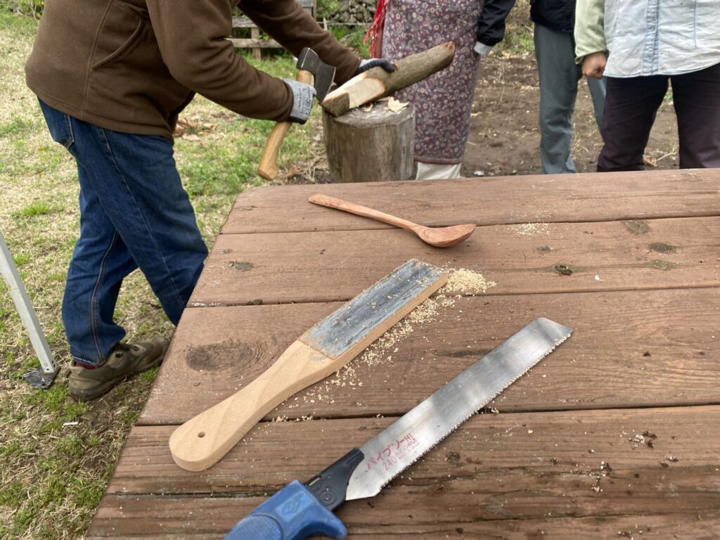나무냄새를 맡고 도끼와 우드카빙 도구들의 사용법을 관람