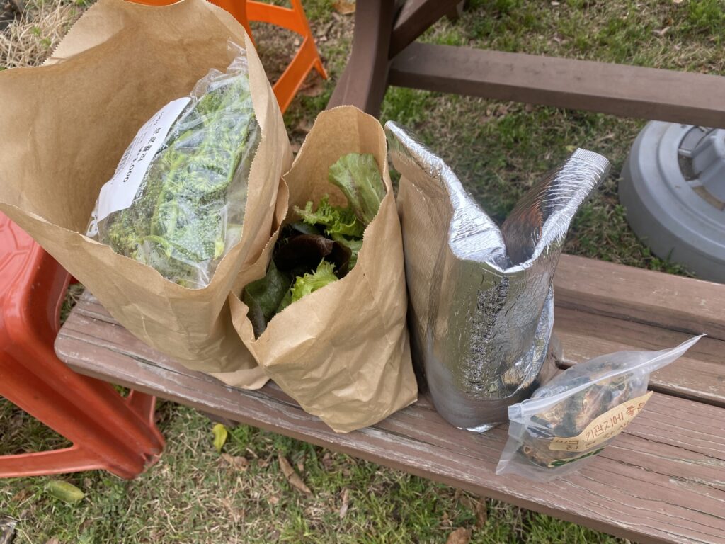 밤마다 기침이 심해서.. 약으로 쓰려고 개복숭아효소와 수세미차를 샀어요. 비염이나 천식이라고 생각했는데 역류성 식도염일 수도 있대요. 먹거리를 사면서 건강 상담. 낼 아침 샐러드 거리를 구했고, 직접 만드신 막걸리 한 병 샀고요. 여농 선생님들께서 브로콜리와 무, 양배추도 주셨습니다. 전에 합 마켓에서도 그랬는데 생산자분들이 “집에서 요리를 해먹어요?”를 먼저 물으시더라고요. 그게 되게 많은 것과 연관된 중요한 질문인 것 같아요. 노동시간과 건강과 소비와.. 제주에서 꾸러미를 보낼 때에 도시의 어린이들이 먹거리 경험을 해 보는 것에도 주안점을 두고 계시다고 얘기해주셨어요.